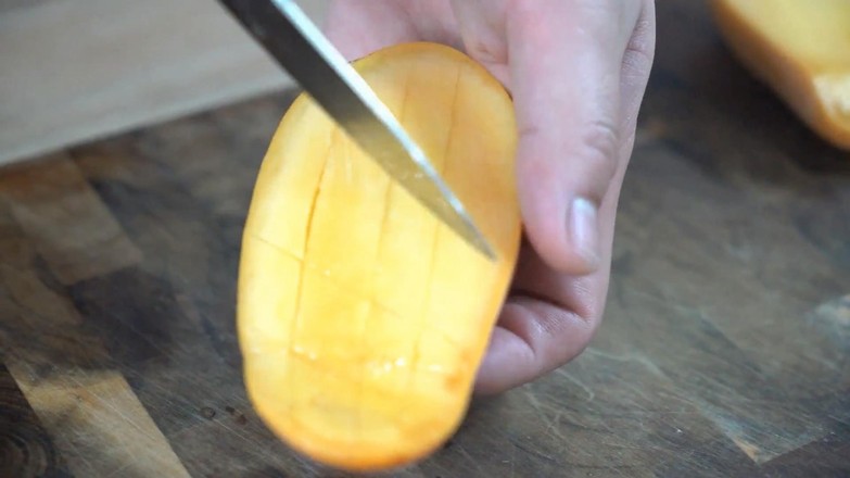 2.芒果對(duì)半切開(kāi)再橫豎各劃數(shù)刀。